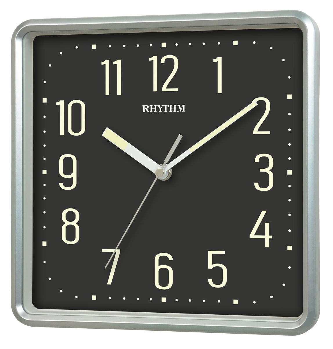 Neliön muotoinen Rythm-seinäkello mustalla kellotaululla ja hiljaisella koneistolla.